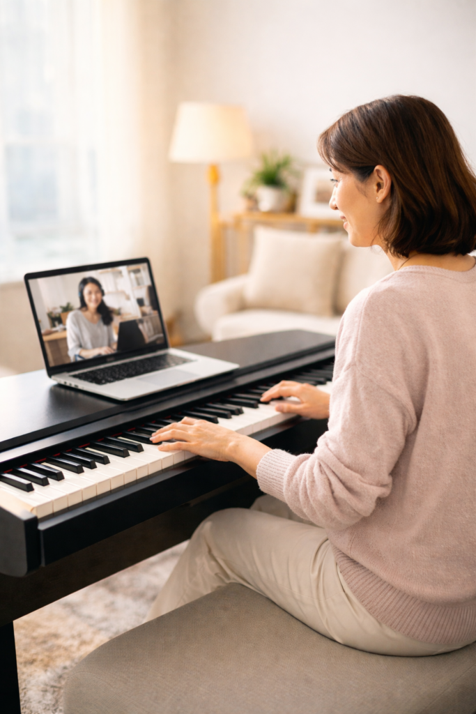 大人の初心者にとって大事なのは、最初から完璧に弾けることよりも、無理なく続けられることです。 オンラインなら、自宅で落ち着いて受けやすいぶん、始めるハードルを下げやすいのが大きなメリットです。